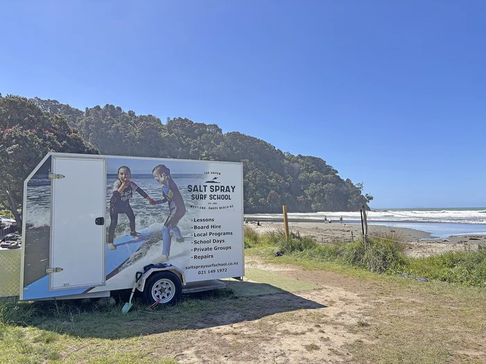Beachgoers are encouraged to pop by the Salt Spray Surf School tent for advice about which areas are currently safe to swim in. The team have borrowed Whakatāne Surf Life Saving Club’s “danger” sign to mark where the rip is located.