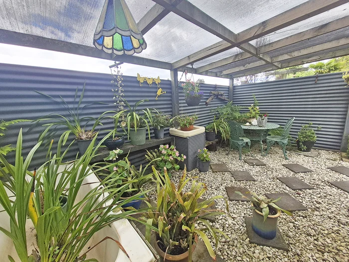The garden’s sculptural pieces include a machine-gun-shaped artwork made by a neighbour from a motorbike tank. A sculpture created by a granddaughter as a school project also holds pride of place.