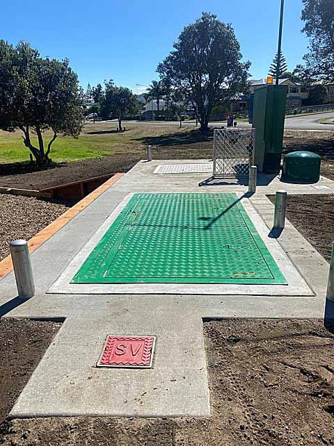 BUDDLE STREET: Works will take place on the right-hand side of the photo, along the service lane section of road, including the Buddle Street New World exit. The finished pump station will be larger and different in scale, but most of the infrastructure will be underground like this one in Fisherman’s Drive, pictured below. Photos supplied